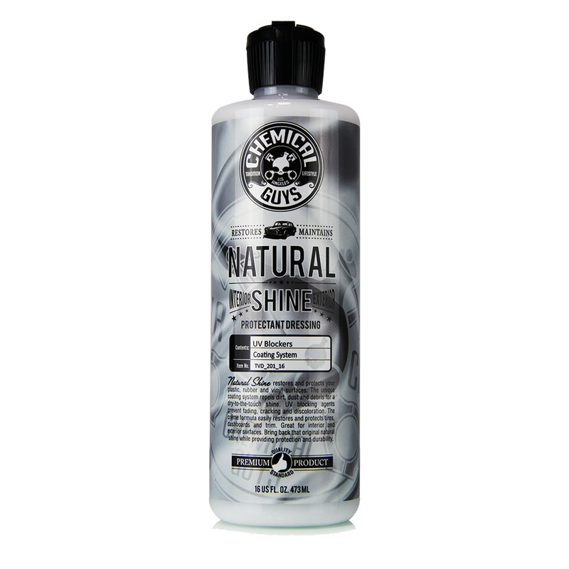 Después de limpiar las llantas, los tableros de instrumentos, el vinilo y las molduras de plástico, es importante aplicar un cobertor para proteger las superficies y agregar un poco de brillo. Natural Shine nutre y devuelve las superficies a su brillo original. Úselo en neumáticos, tableros y molduras para crear una apariencia natural y seca al tacto que evita la apariencia de productos aceitosos y demasiado brillantes más baratos.