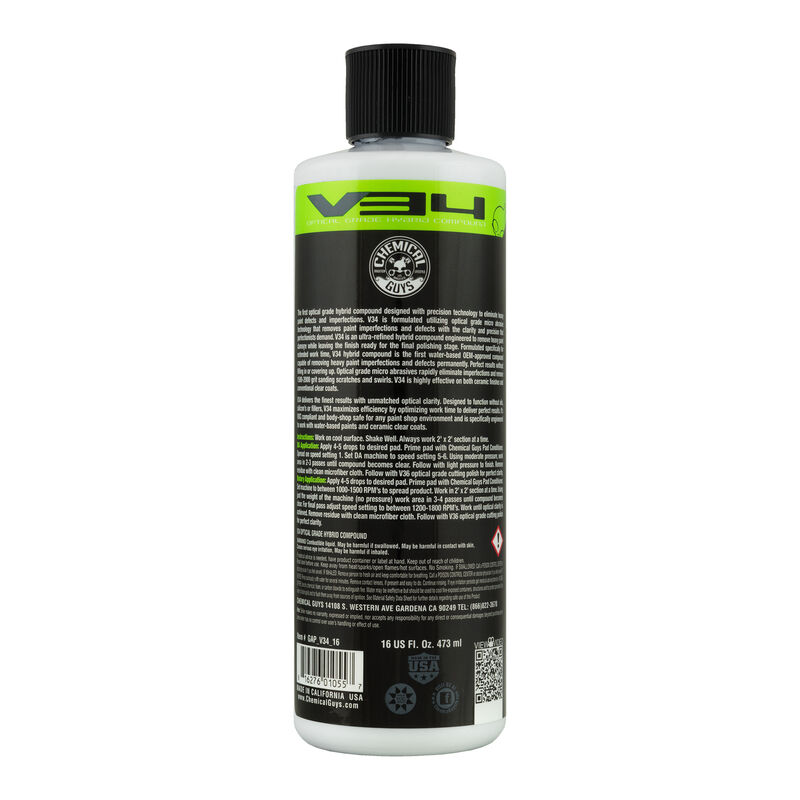 La formula a base de agua se mezcla con lubricantes avanzados para un tiempo de trabajo prolongado. Utilice V34 con cualquier pulidora rotativa o doble acción para eliminar arañazos y defectos de la superficie así como para restaurar el brillo de cualquier acabado de pintura.