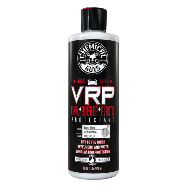 Las molduras hechas de vinilo, caucho y plástico son sensibles a la decoloración y las manchas causadas por la exposición a los dañinos rayos UV, el agua y las fuentes de contaminación. VRP ayuda a restaurar una apariencia como nueva a las piezas de plástico , caucho y vinilo exterior e interior del automóvil. Restaura un brillo negro intenso como nuevo.